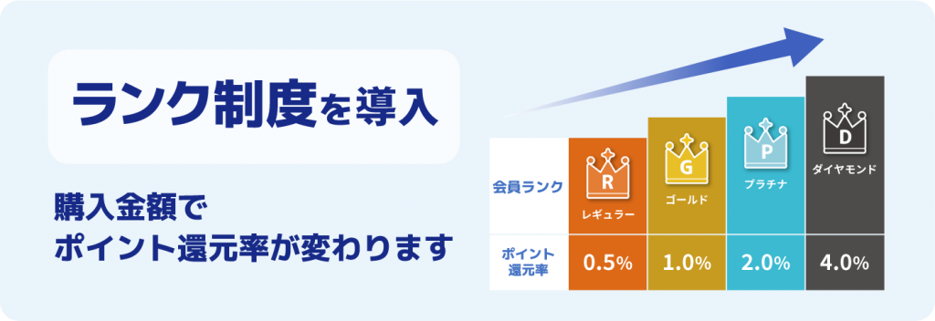 年間の購入金額に応じて会員ランクが上がり、付与率が段階的にアップ。