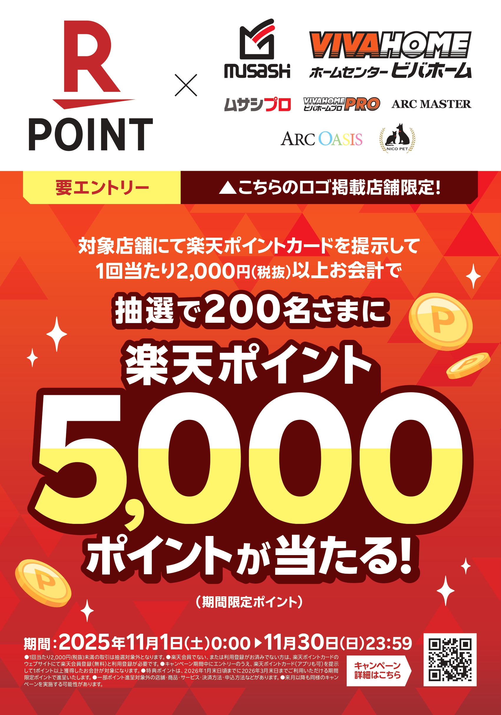 ※1回あたり2,000円未満の取引は特典対象外となります。※オンラインショップは対象外です。※楽天会員でない、または利用登録がお済みでない方は、楽天ポイントカードのウェブページにて楽天会員登録(無料)と利用登録が必要です。※キャンペーン期間中にエントリーのうえ、楽天ポイントカード(アプリも可)を提示して1回あたり2,000円(税抜)以上購入された方の中で抽選で200名さまに5,000ポイント進呈いたします。※対象ブランド内一部店舗では導入しておりません。※特典ポイントは、2026年1月末日頃までに2026年3月末日までご利用いただける期間限定ポイントで進呈いたします。※一部ポイント進呈対象外の店舗・商品・サービス・決済方法・申込方法などがあります。※来月以降も同様のキャンペーンを実施する可能性があります。
