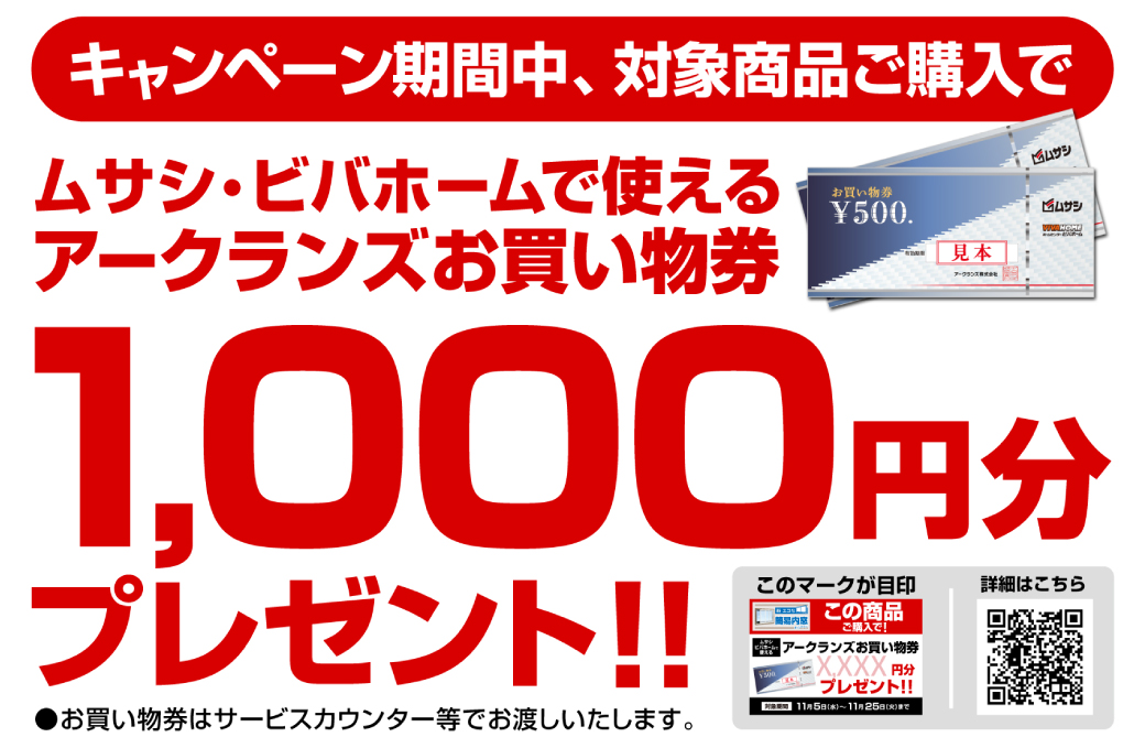 期間中、対象商品をお買い上げで、ムサシ・ビバホームで使えるアークランズお買い物券1,000円分プレゼント🎁