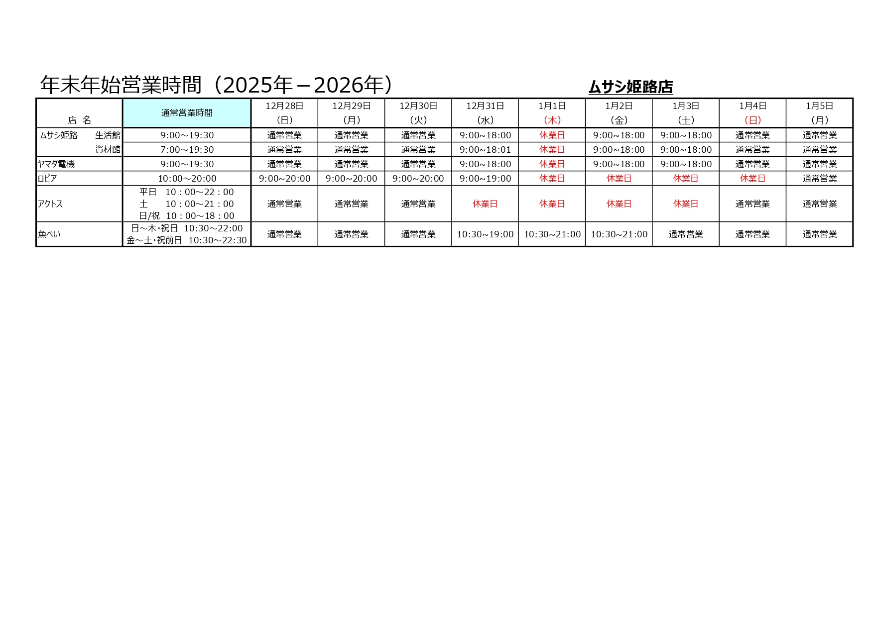 お知らせ 2025年12月24日 各テナント 年末年始営業時間のお知らせ 年末年始期間中の店舗及び各テナントの営業時間につきましては、以下のとおりです。 ※営業時間は変更になる場合がございますのでご了承ください。詳細は各ショップまでお問い合わせをお願いいたします。
