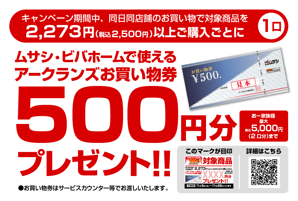 期間中、対象商品を同日同店舗にて2,273円(税込 2,500円)以上ご購入ごとに、ムサシ・ビバホームで使えるアークランズお買い物券500円分プレゼント🎁