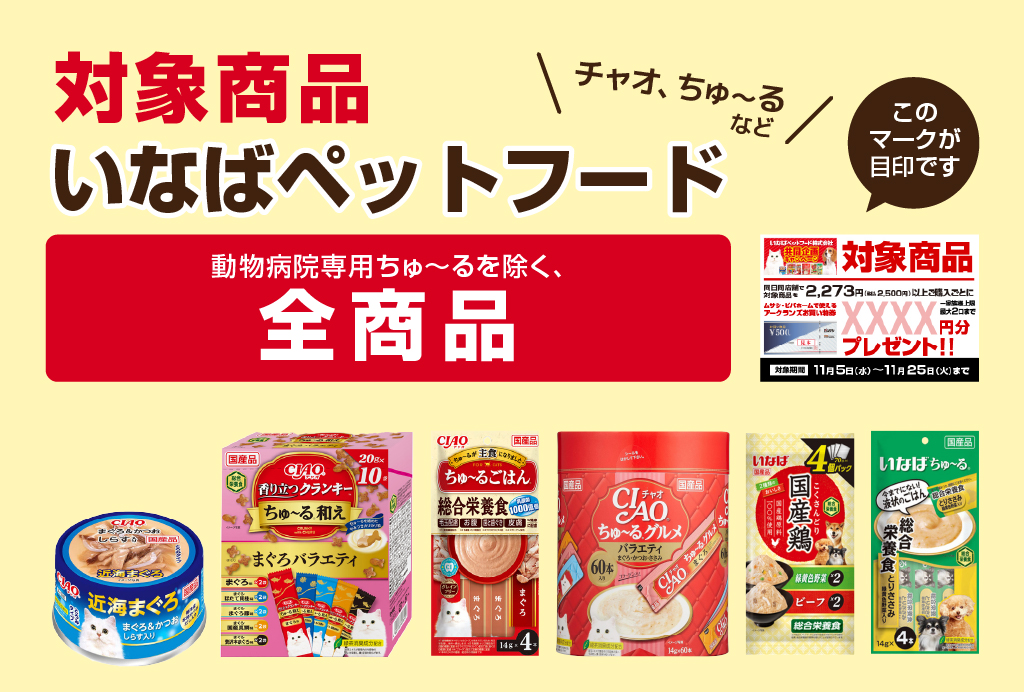 CIAO(チャオ)、ちゅ~る、犬ちゅ~る、ちゅるビ~、ちゅ~るごはん、すごい乳酸菌、コージーライフ、ツナと緑黄色野菜スティック、まぐろジュレ、わがまま猫とろみ、前浜の魚、焼かつおクランキー、マルウオ白身のせパウチ、おいしい缶まぐろ、金のだしシリーズなどが対象となります。