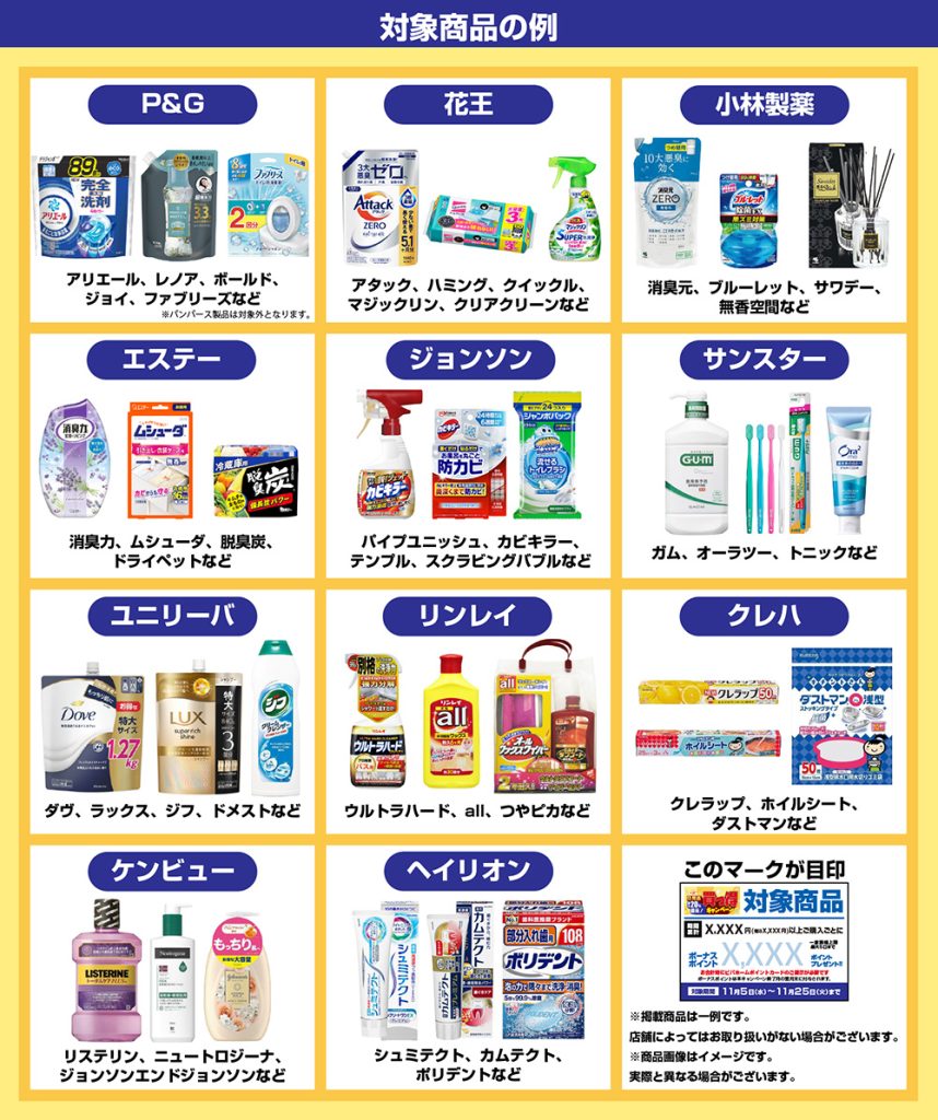 洗剤、シャンプー、ボディソープ、ベビー用品、入浴剤、オーラルケア、消臭剤などが対象となります!