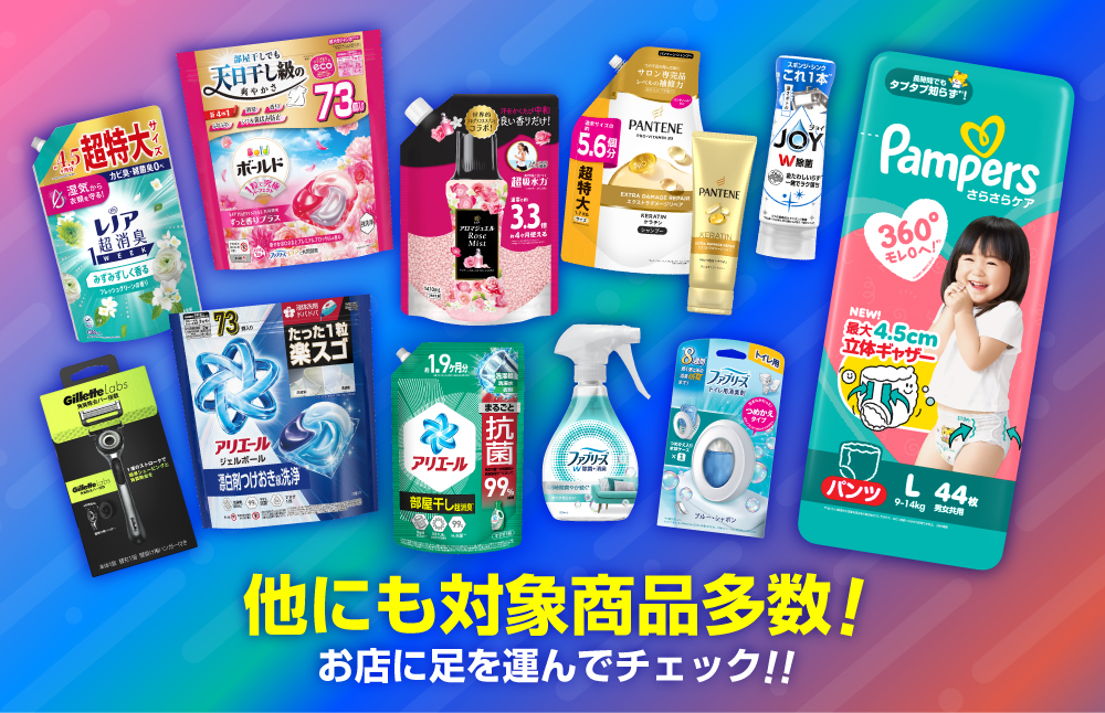 対象ブランドはアリエール、ボールド、さらさ、レノア、JOY、ファブリーズ、パンテーン、h&s、Herbal Essences、パンパース、ウィスパー、ジレット、ジレット ヴィーナス、オーラルB、ブラウンなど