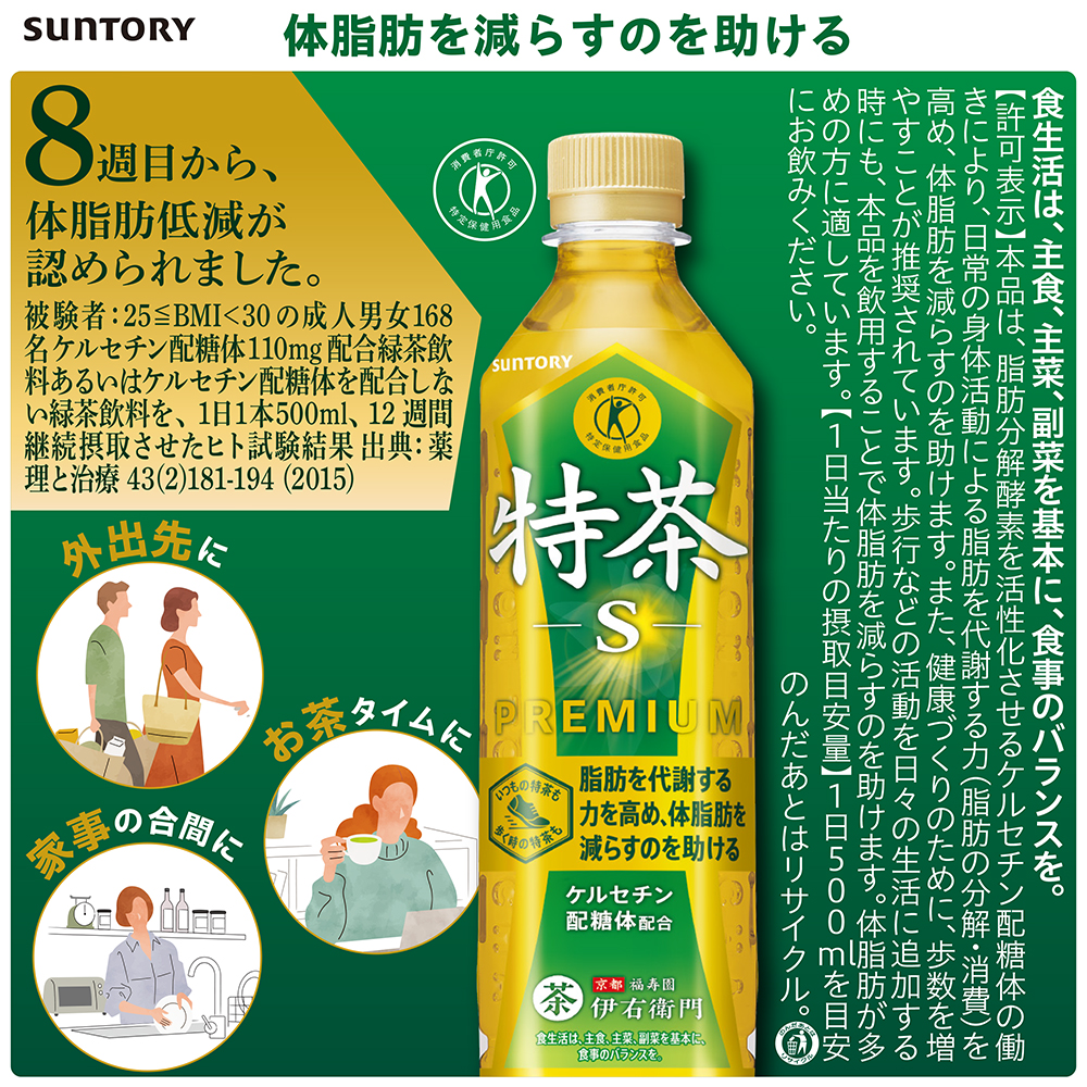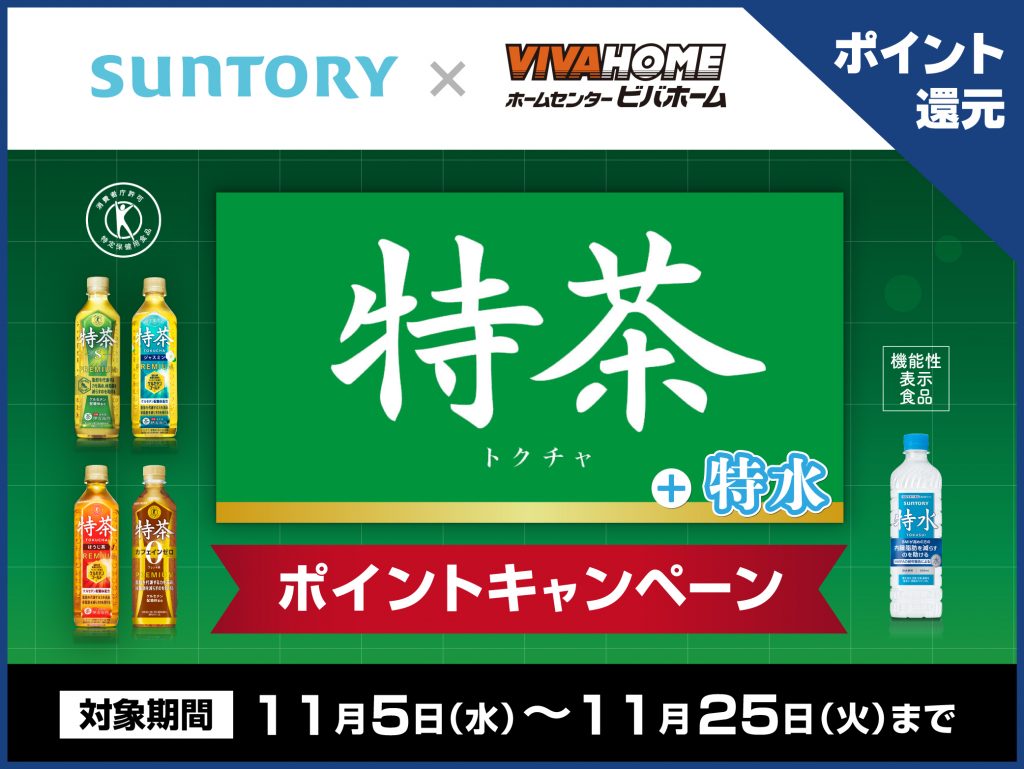 サントリーの特茶シリーズ(特茶・ホット特茶・特茶ジャスミン・特茶ほうじ茶・特茶カフェインゼロ)と特水が対象となります!