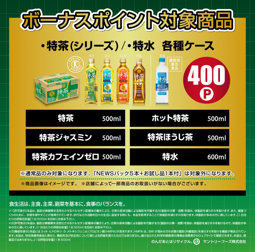 特茶シリーズ・特水のケースを買って、ボーナスポイントをもらおう!