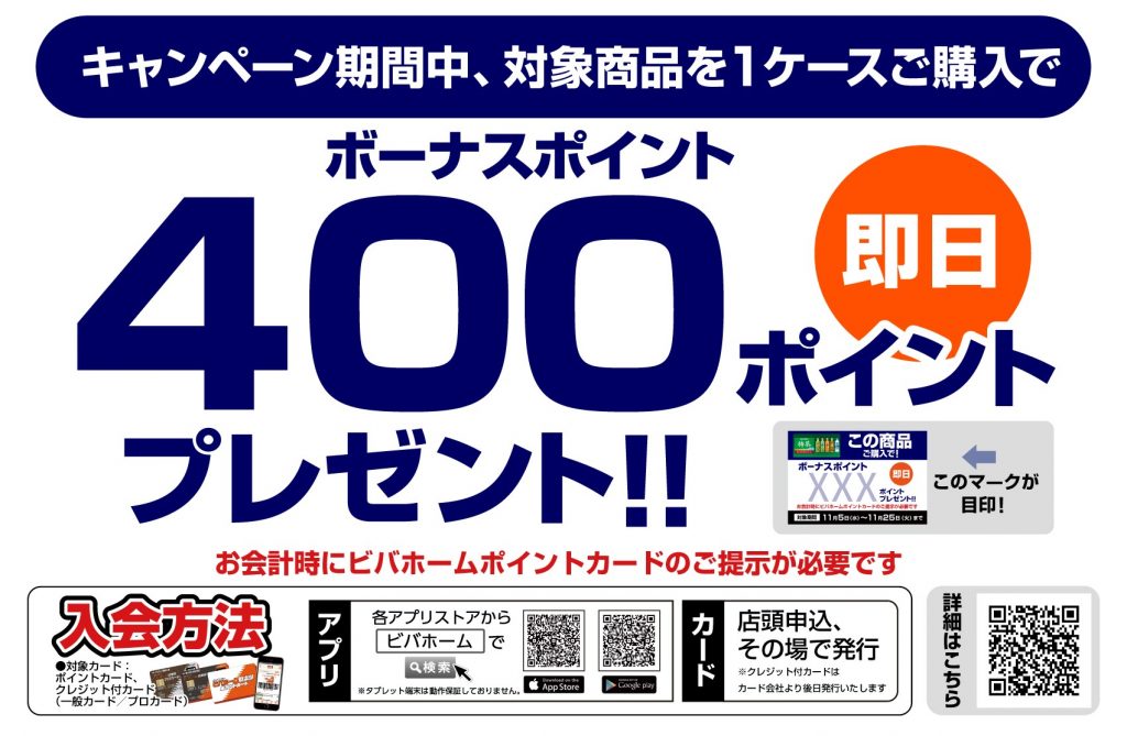 ビバホーム倶楽部カードのボーナスポイント400ポイントプレゼント!