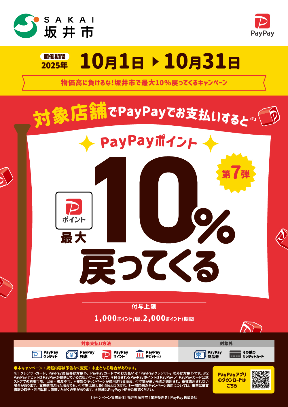 坂井市のPayPay最大10%戻ってくるキャンペーンがご利用いただけます!