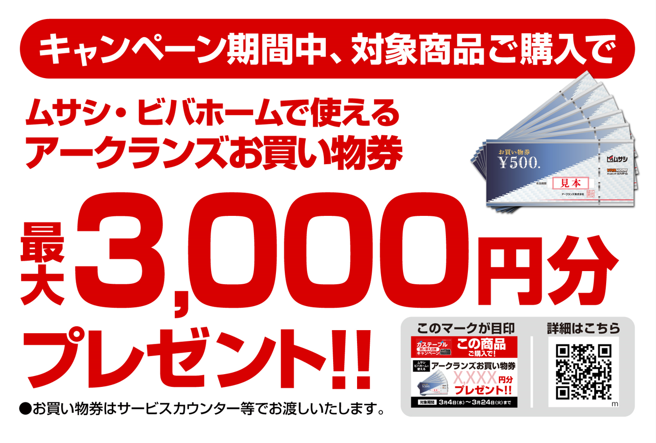 ビバホーム・ムサシなどで使えるアークランズお買い物券3,000円分プレゼント🎁