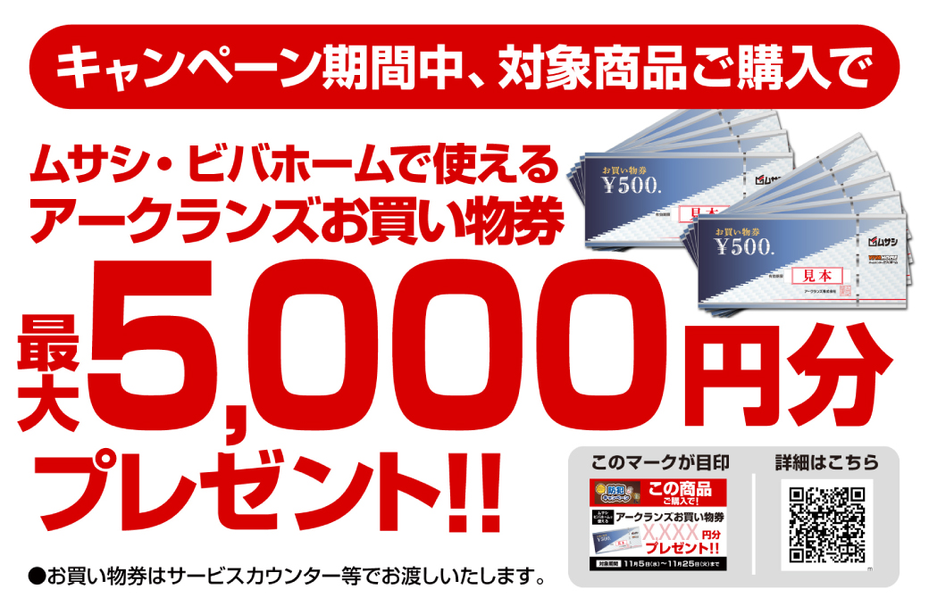 期間中、対象商品をお買い上げで、ムサシ・ビバホームで使えるアークランズお買い物券500~5,000円分プレゼント🎁