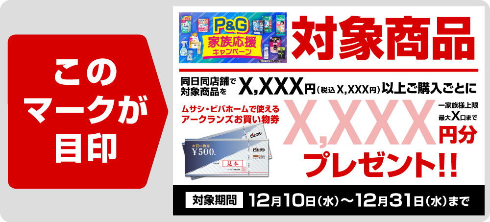 対象ブランドはアリエール、ボールド、さらさ、レノア、JOY、ファブリーズ、パンテーン、h&s、Herbal Essences、パンパース、ウィスパー、ジレット、ジレット ヴィーナス、オーラルB、ブラウンなど