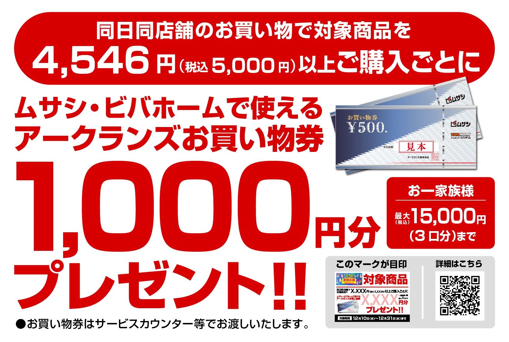 同日同店舗のお買い物で対象商品を4,546円(税込 5,000円)以上ご購入ごとに、ムサシ・ビバホームで使えるアークランズお買い物券1,000円分プレゼント🎁