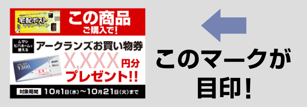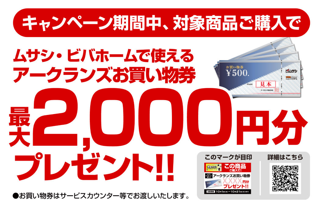 期間中、対象の商品をお買い上げで、ムサシ・ビバホームで使えるアークランズお買い物券500~2,000円分プレゼント🎁