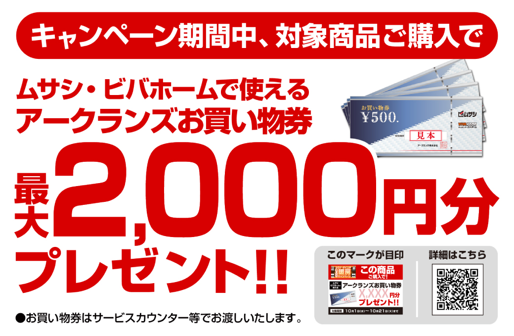 期間中、対象の商品をお買い上げで、ムサシ・ビバホームで使えるアークランズお買い物券最大2,000円分プレゼント🎁