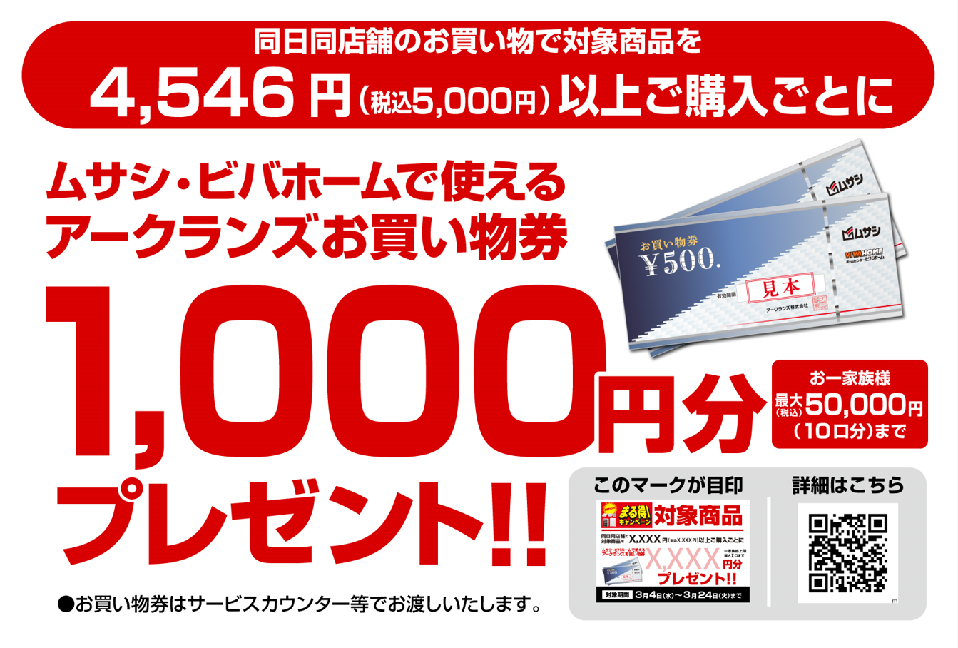 キャンペーン期間中、同日同店舗にて対象商品を4,546円(税込 5,000円)以上ご購入ごとに、ビバホーム・ムサシなどで使えるアークランズお買い物券1,000円分プレゼント🎁