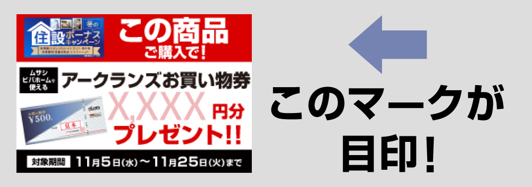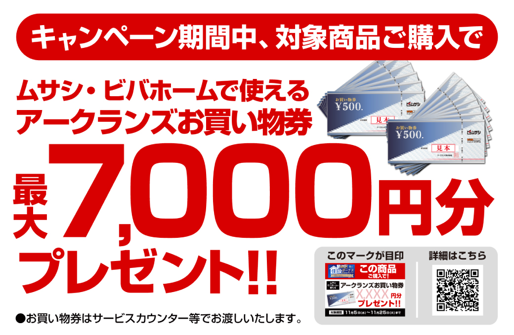 期間中、対象商品をご購入でムサシ・ビバホームで使えるアークランズお買い物券最大7,000円分プレゼント🎁