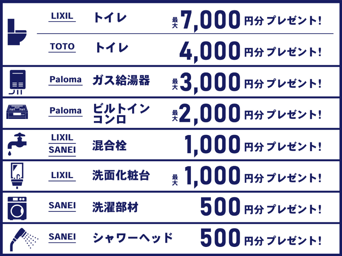給湯器、トイレ、ビルトインコンロ、混合栓、洗濯部材、洗面化粧台、シャワーヘッド