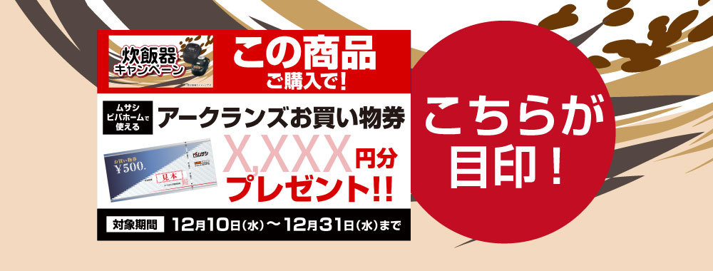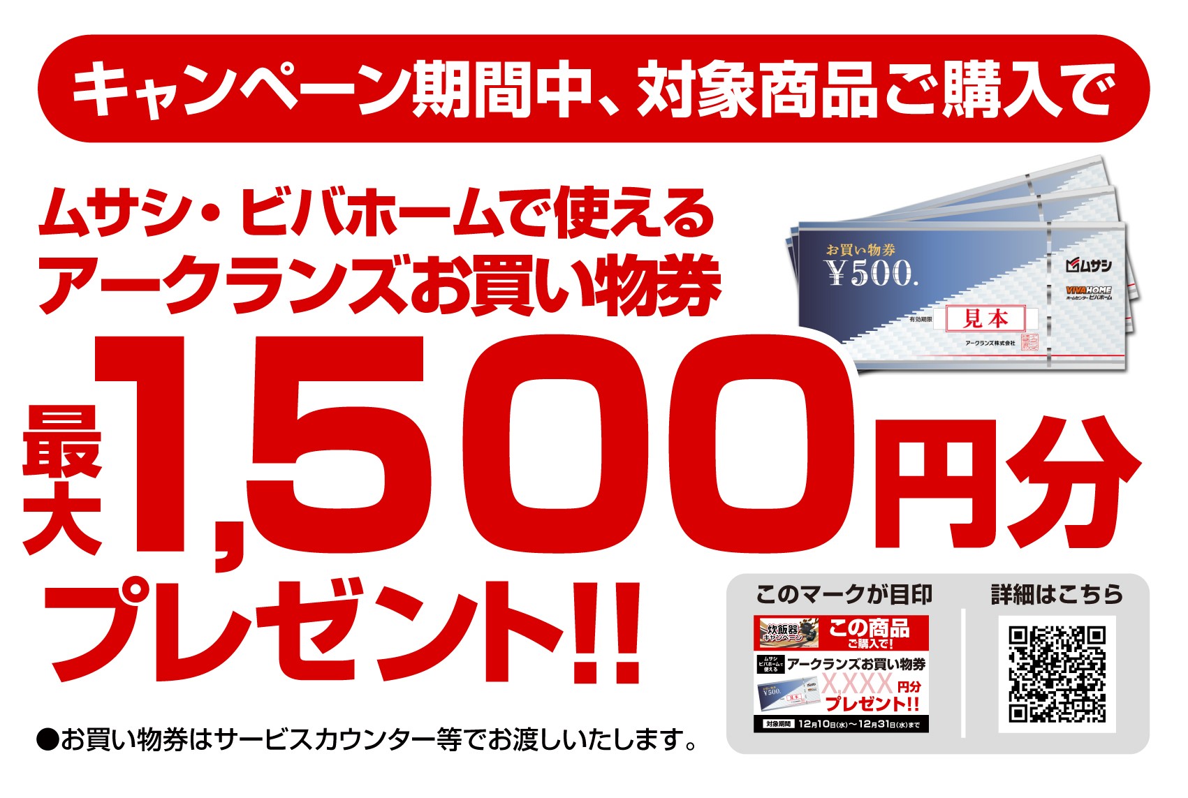 期間中、対象商品をお買い上げで、ムサシ・ビバホームで使えるアークランズお買い物券最大1,500円分プレゼント🎁